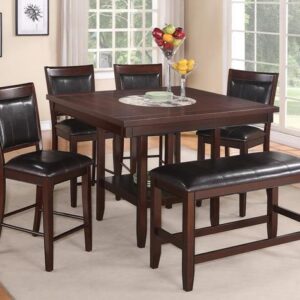 Material Wood, Fabric Measurements Dining Table Assembled : 60.38″ W x 36.38″ D x 30″ H Side Chair Assembled : 17.38″ W x 20.25″ D x 38.38″ H Bench Assembled : 42.13″ W x 14.88″ D x 19.13″ H SKU Numbers Brown Color Dining Table Set D422-325